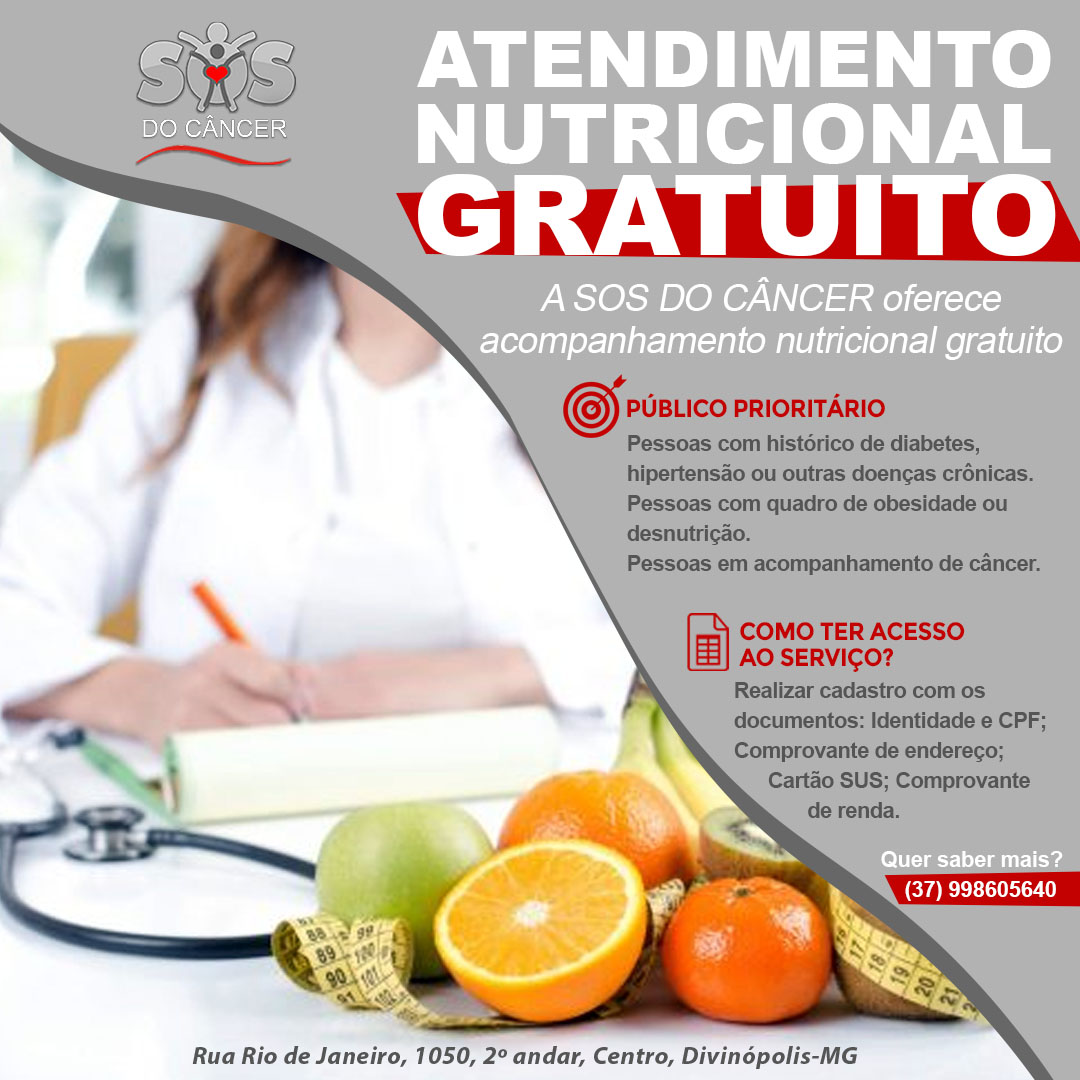 A SOS DO CÂNCER oferece acompanhamento nutricional gratuito e estamos com horários disponíveis para atendimento.